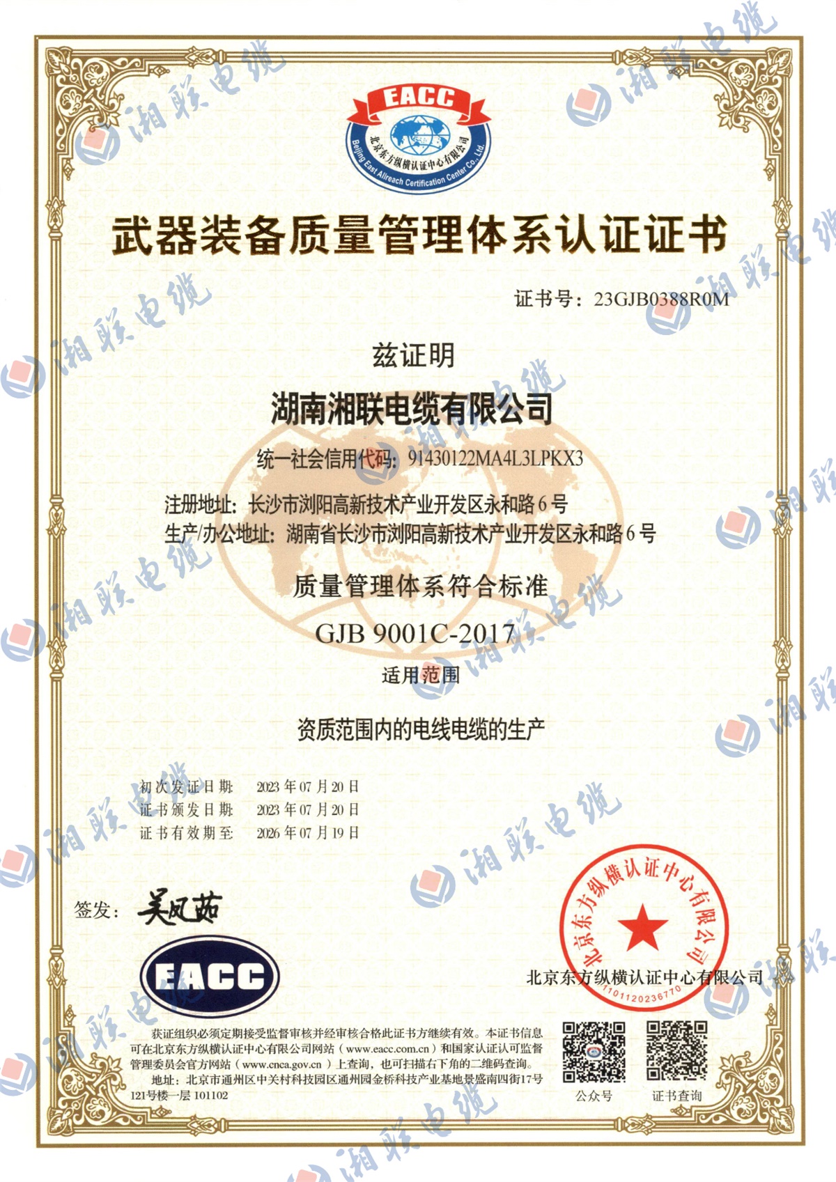 7月,湘聯電纜順利通過國軍標質量管理體系認證,獲得《武器裝備質量管理體系認證證書》。