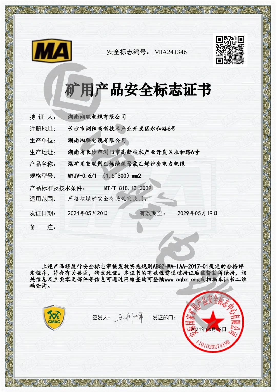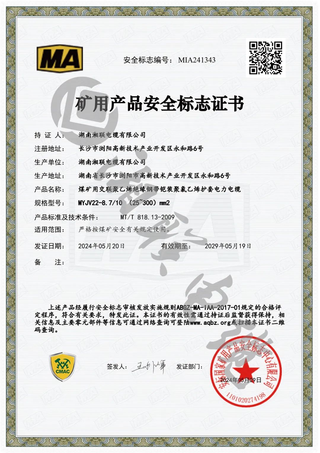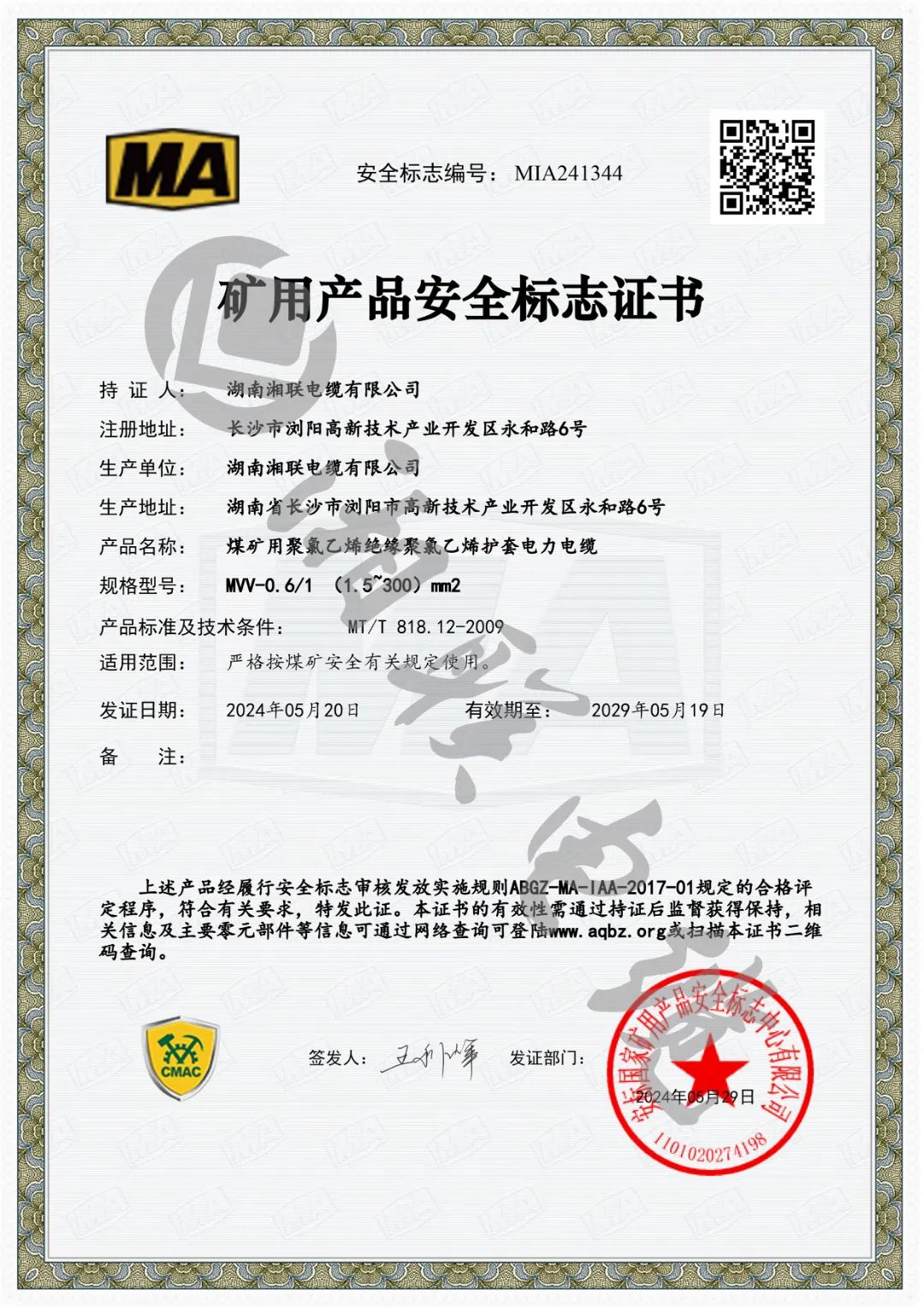 權威認證,湘聯電纜順利取得礦用產品安全標志證書!