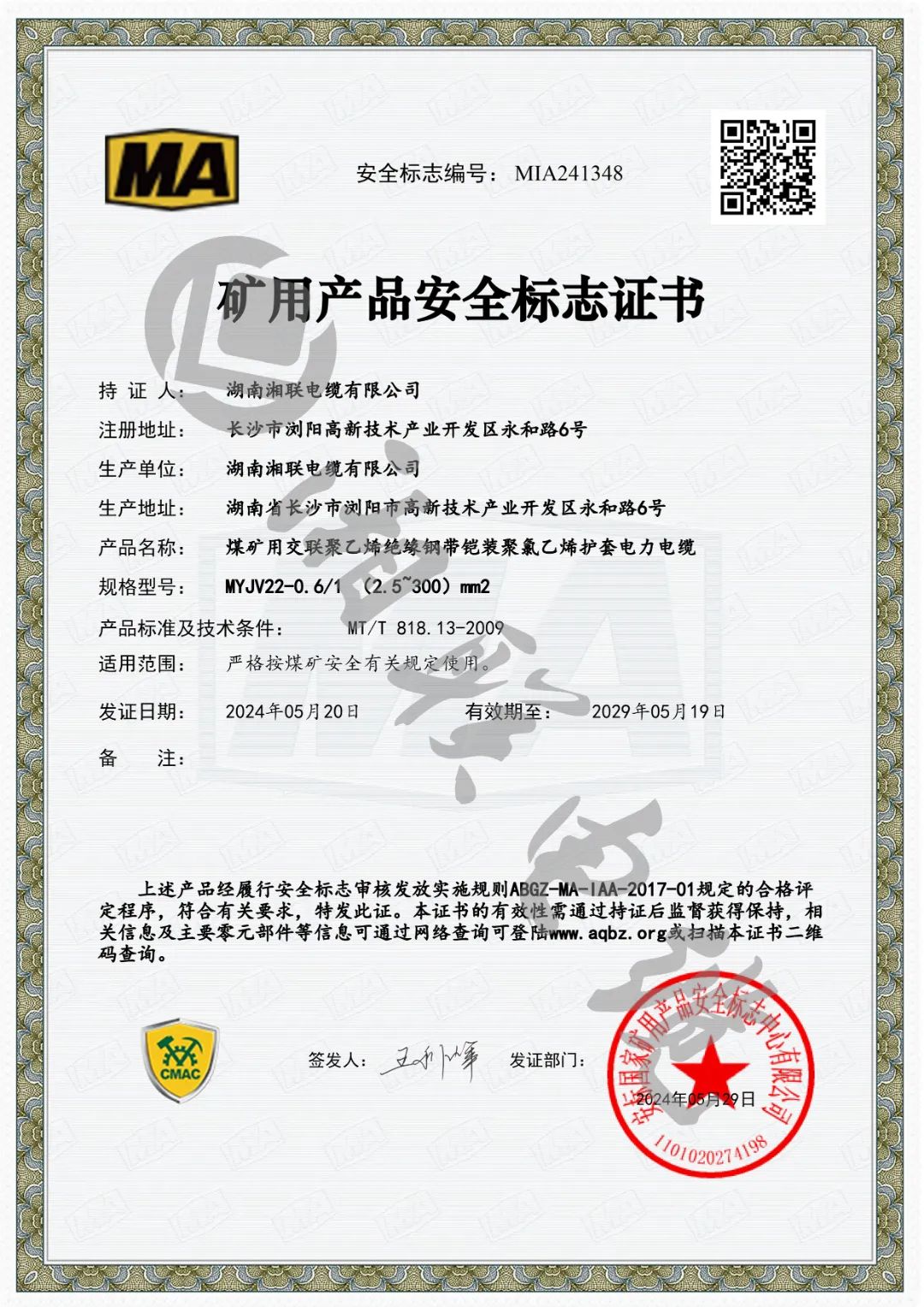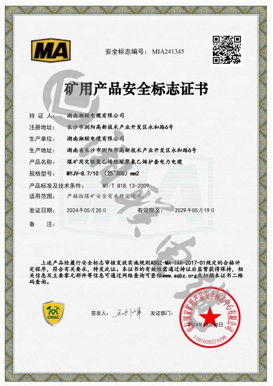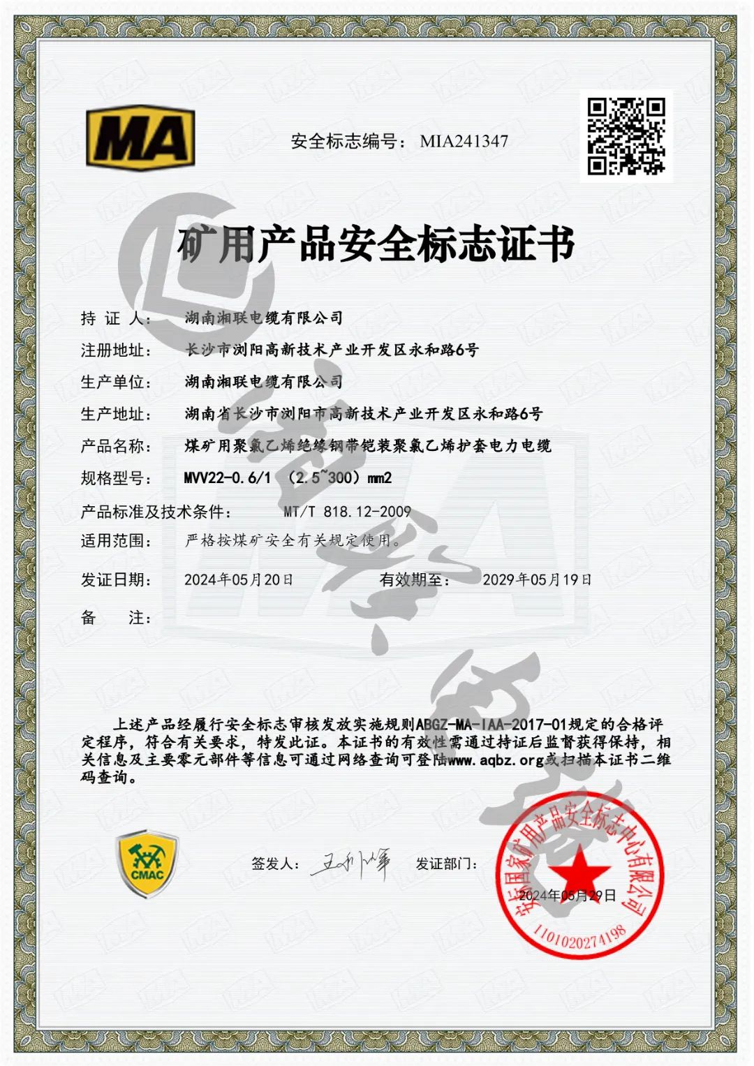 權威認證,湘聯電纜順利取得礦用產品安全標志證書!