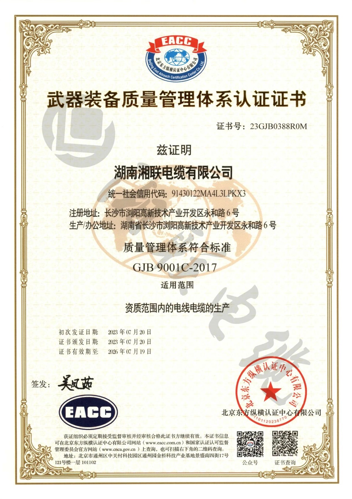 2023年,湘聯(lián)電纜順利通過(guò)國(guó)軍標(biāo)質(zhì)量管理體系認(rèn)證,獲得《武器裝備質(zhì)量管理體系認(rèn)證證書(shū)》,質(zhì)量管理體系符合:GJB9001C-2017標(biāo)準(zhǔn),這表明湘聯(lián)電纜的質(zhì)量管理體系符合武器裝備質(zhì)量管理體系的標(biāo)準(zhǔn)及相關(guān)要求,具備軍品研發(fā)、生產(chǎn)和服務(wù)的質(zhì)量管理能力。